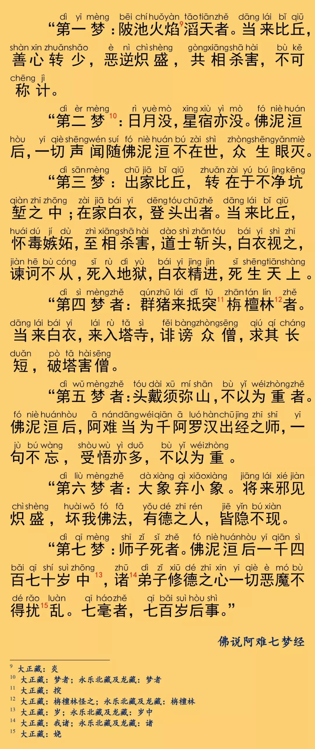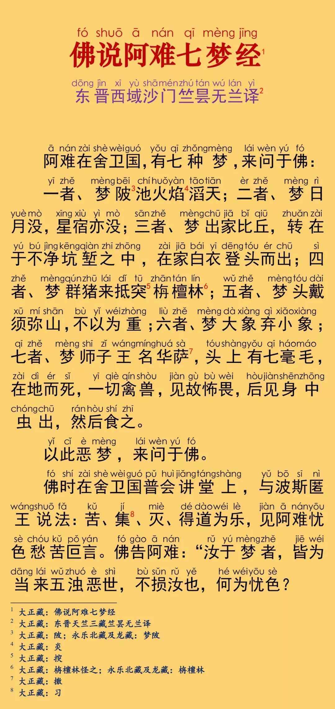 根据《乾隆大藏经》小乘单译经,第0714部,东晋西域沙门竺昙无兰译《佛说阿难七梦经》原藏影印校正注音。句读、注音及读诵音频仅作参考。设计排版说明:本注音佛经内容,由仁慧草堂编辑设计制作,如需转载请联系作者公众号,特此说明。