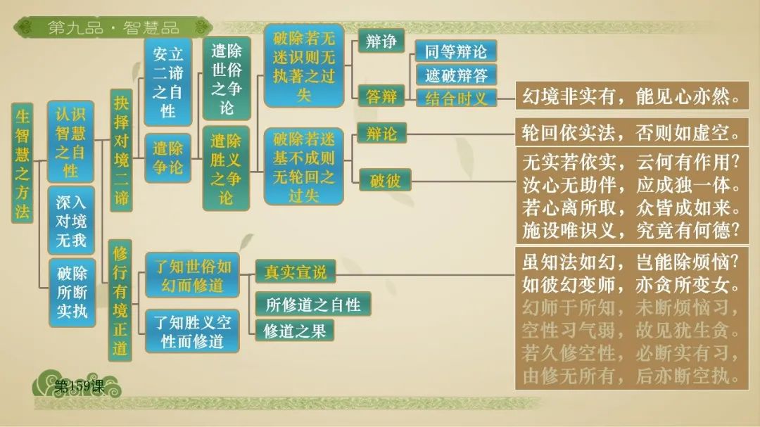 🔹本课内容涉及两个大科判。一是继续在“抉择对境二谛”中与唯识宗进行“遣除胜义之争论”;二是在新的大科判“修行有境正道”中与有实宗进行关于修道的辩论。具体归摄如下:
